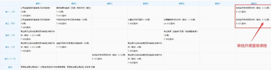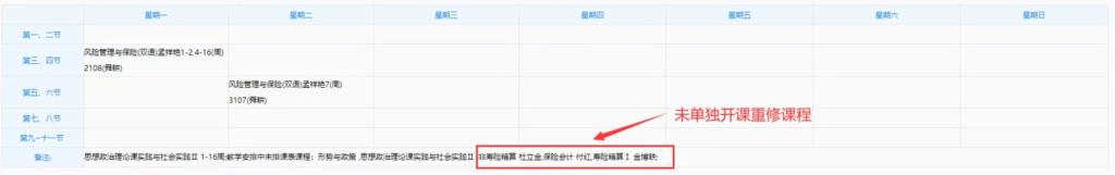 如上图所示:在“学期理论课表”中开课周次为“5-12”或者“6-13”周并安排了上课时间和地点的重修课程(红框处所示)。