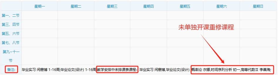 在“学期理论课表”中开课周次为“3-10”、“4-11”、“3-5”或“7-9”周并安排了上课时间和地点的重修课程。如下图所示: