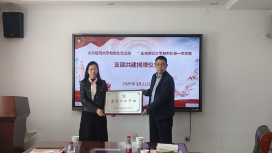 交流活动结束后,双方共同学习了习近平总书记关于深入贯彻中央八项规定精神的重要讲话和重要指示精神,并举行山东建筑大学教务处党支部与山东财经大学教务处第一党支部共建揭牌仪式。