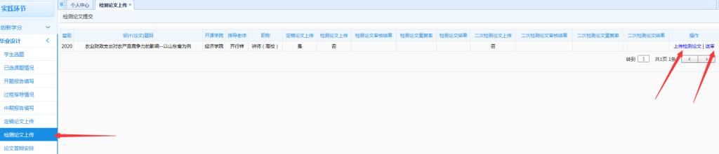 第一步,4月25日前,按照“实践环节-毕业设计-检测论文上传”路径,于系统中“上传检测论文”并“送审”。一旦“送审”,不能再次上传或修改。(注:隐名评阅未通过的同学,没有检测论文上传和送审的权限。)