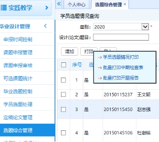 (1)开题报告、中期检查报告,从“选题综合管理”模块,点击“打印”,可以批量下载;