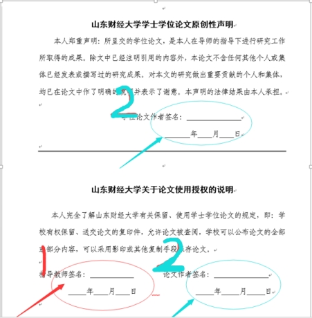 (3)答辩结束后,将终稿毕业论文上传系统(如需修改,需要按要求进行修改后再行上传)。终稿论文上传工作特别注意事项说明如下:本科毕业论文(设计),内含《山东财经大学学士学位论文原创性声明》及《山东财经大学关于论文使用授权的说明》页,此处需要论文作者本人及其指导教师手写签名。具体操作办法,可参考如下:学生完成论文答辩工作后,将此页打印,由本人手写签名,并请指导老师手写签名后,将此页扫描(或拍照),替换掉原来的空白签名页,形成毕业论文(设计)电子终稿,上传教务管理系统。