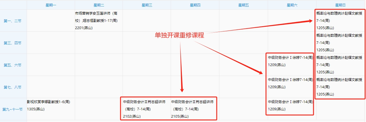 在“学期理论课表”中开课周次为“7-14”、“7-9”或“10-12”周并安排了上课时间和地点的重修课程。如下图所示: