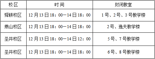 2024年12月大学英语四、六级考试定于12月14日上午9:00—11:20、下午15:00—17:25进行。根据省教育招生考试院的要求,考试期间需对考场进行封闭管理,经学校研究决定, 14日(周六)白天停课(晚上按照正常教学安排上课)。为保障考试顺利进行,以下时间段内相应地点封闭,请同学们予以配合,自觉带走个人物品。