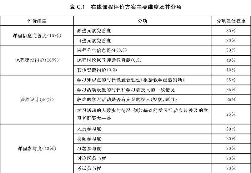 具体来看,评价方案方面,方案主要从课程信息完善度、课程建设维护、课程设计、课程参与度四个主要维度进行评价。其中,课程设计和课程参与度权重较高,各占40%。课程信息完善度及课程建设维护各占10%。